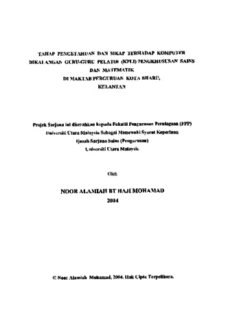 Noor Alamiah, Mohamad (2004) Tahap Pengetahuan dan Sikap Terhadap Komputer di Kalangan Guru-guru Pelatih (KPLI) Pengkhususan Sains dan Matematik di Maktab Perguruan Kota Bharu. Masters thesis, Universiti Utara Malaysia.