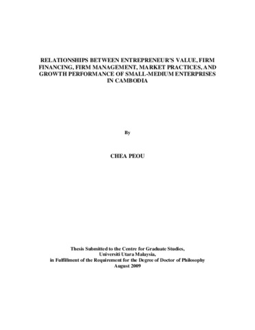 Peou, Chea (2009) Relationship Between Entrepreneur's Value,Firm Financing, Firm Management, Market Practices, and Growth Performance of Small-Medium Enterprises in Cambodia. PhD. thesis, Universiti Utara Malaysia.