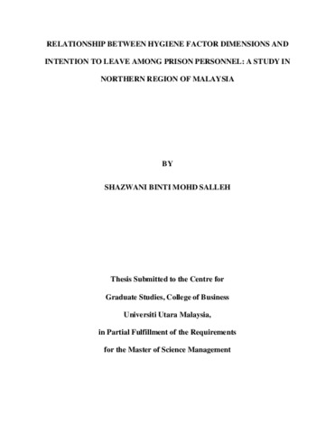 Shazwani, Mohd Salleh (2012) Relationship Between Hygiene Factor Dimensions and Intention to Leave Among Prison Personnel: A Study in Northern Region of Malaysia. Masters thesis, Universiti Utara Malaysia.